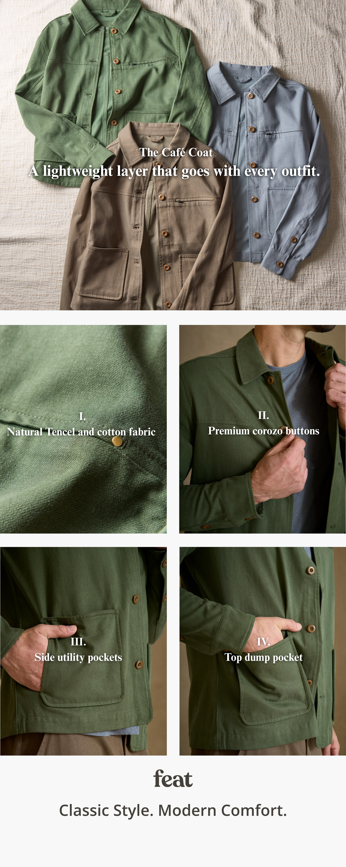 Experience the perfect blend of luxury and functionality with the versatile Café Coat, crafted from the ultra-soft, sustainable blend of 52% TENCEL and 48% Pima Cotton. Its sharp, functional design features two front patch pockets with convenient top and side entry, ensuring easy access and warmth for your hands. Secure your essentials in the discreet chest pocket with a hidden zipper, while elegant, natural Corozo buttons provide a refined finishing touch to this essential layering piece.
